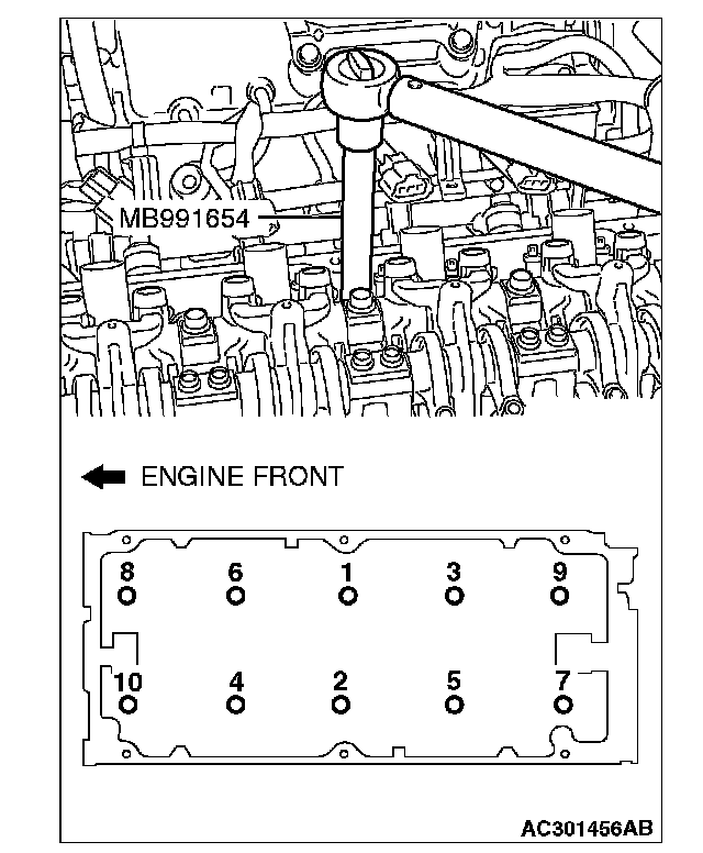 Use special tool MB991654 to tighten the cylinder head bolts in the following procedures.