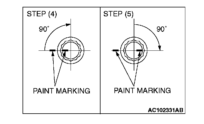 4) Apply a paint mark to the heads of the cylinder head bolts and cylinder head, then tighten 90 degree angle as shown.