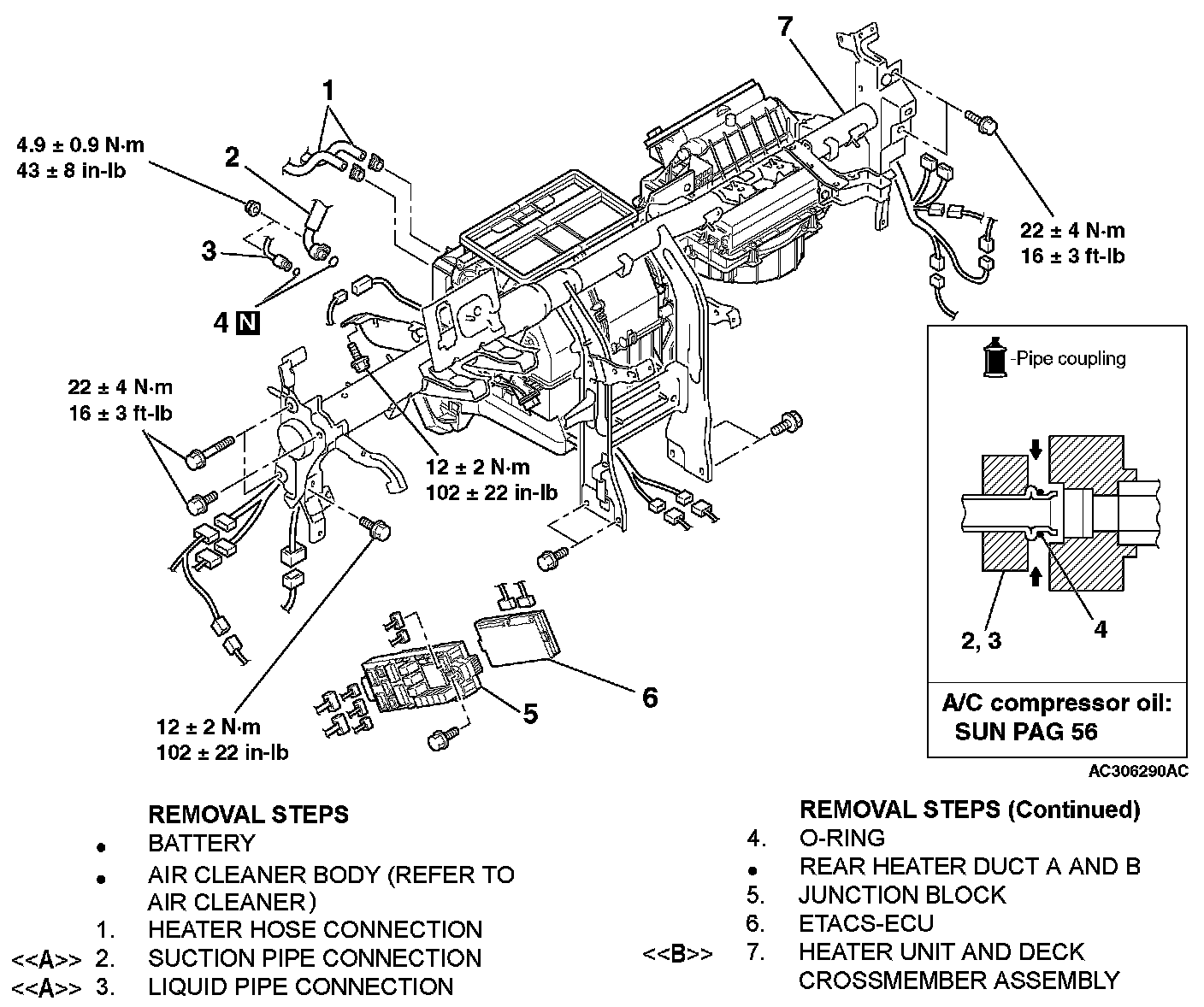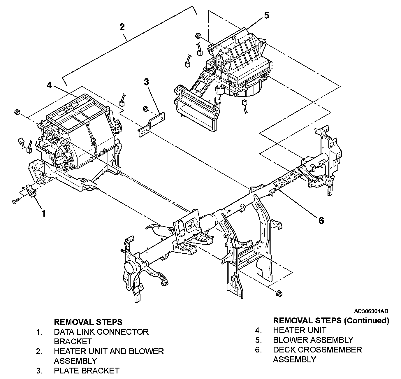 <> HEATER UNIT AND DECK CROSSMEMBER ASSEMBLY REMOVAL
