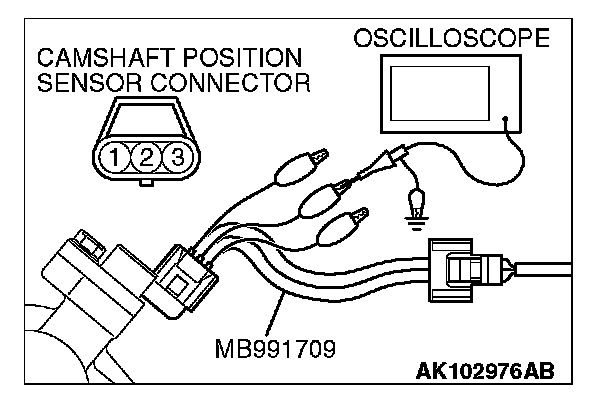 1. Disconnect the camshaft position sensor connector, and connect the test harness special tool (MB991709) between the separated connector (All terminals should be connected).