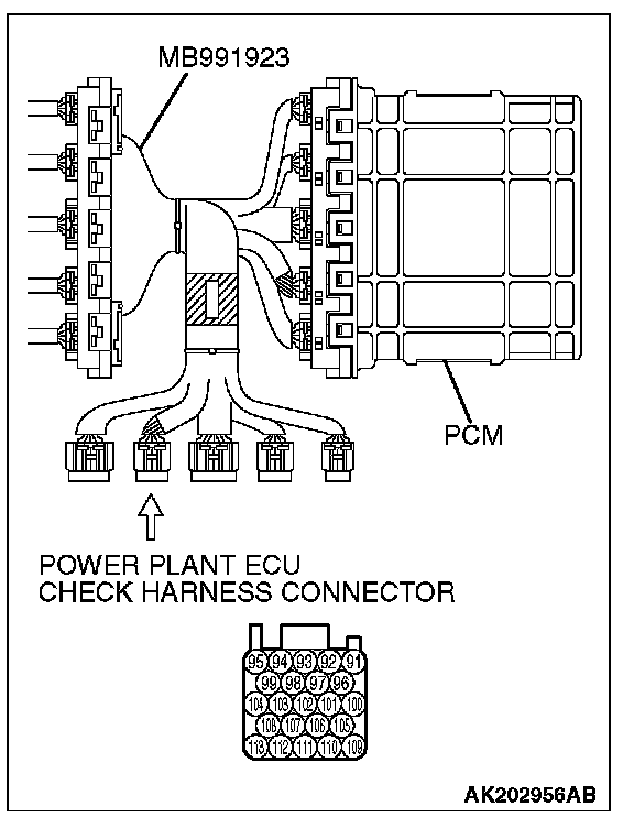 1. Disconnect all PCM connectors. Connect the check harness special tool (MB991923) between the separated connectors.