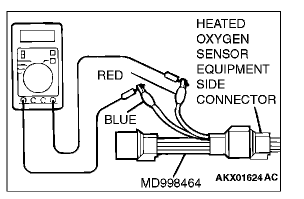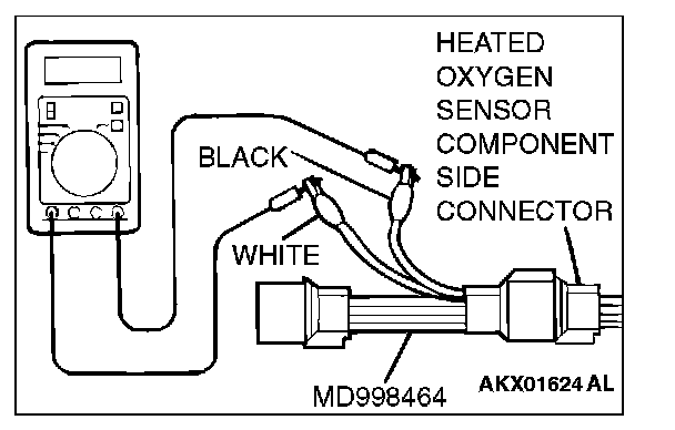 1. Disconnect the heated oxygen sensor connector and connect special tool MD998464 to the connector on the heated oxygen sensor side.