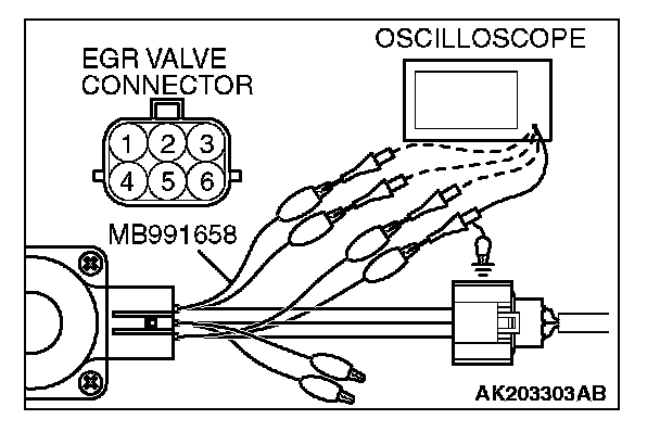 2. Connect the oscilloscope probe to the EGR valve connector terminal No. 1, terminal No. 3, terminal No. 4, terminal No. 6 respectively.