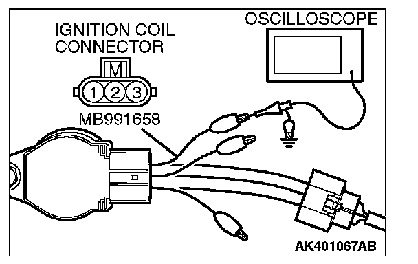 1. Disconnect the ignition coil connector, and connect test harness special tool (MB991658) between the separated connector. (All terminals should be connected.)