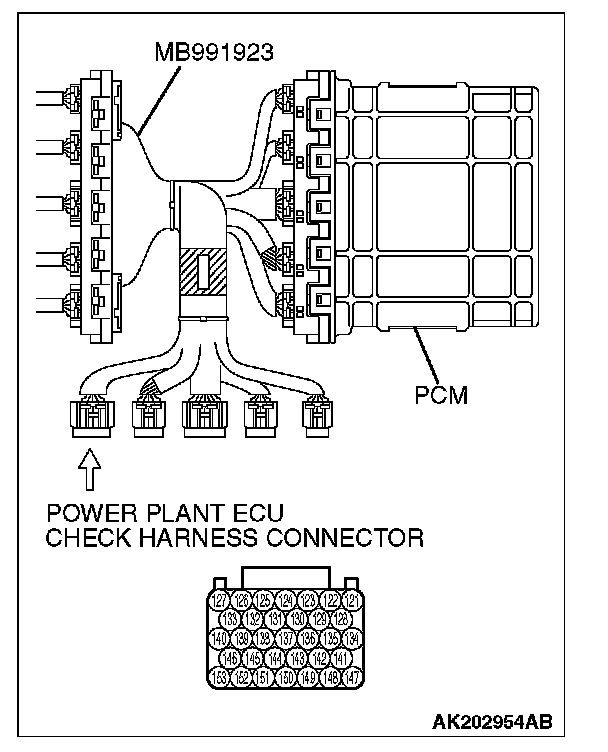 1. Disconnect all PCM connectors. Connect the check harness special tool (MB991923) between the separated connectors.
