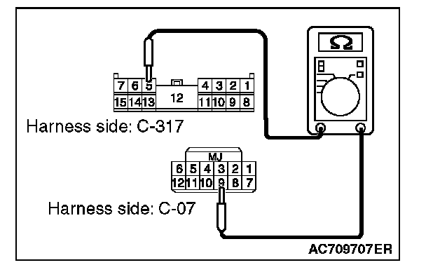3. Check the wiring harness between WCM connector C-07 (terminal No.9) and ETACS-ECU connector C-317 (terminal No.5)