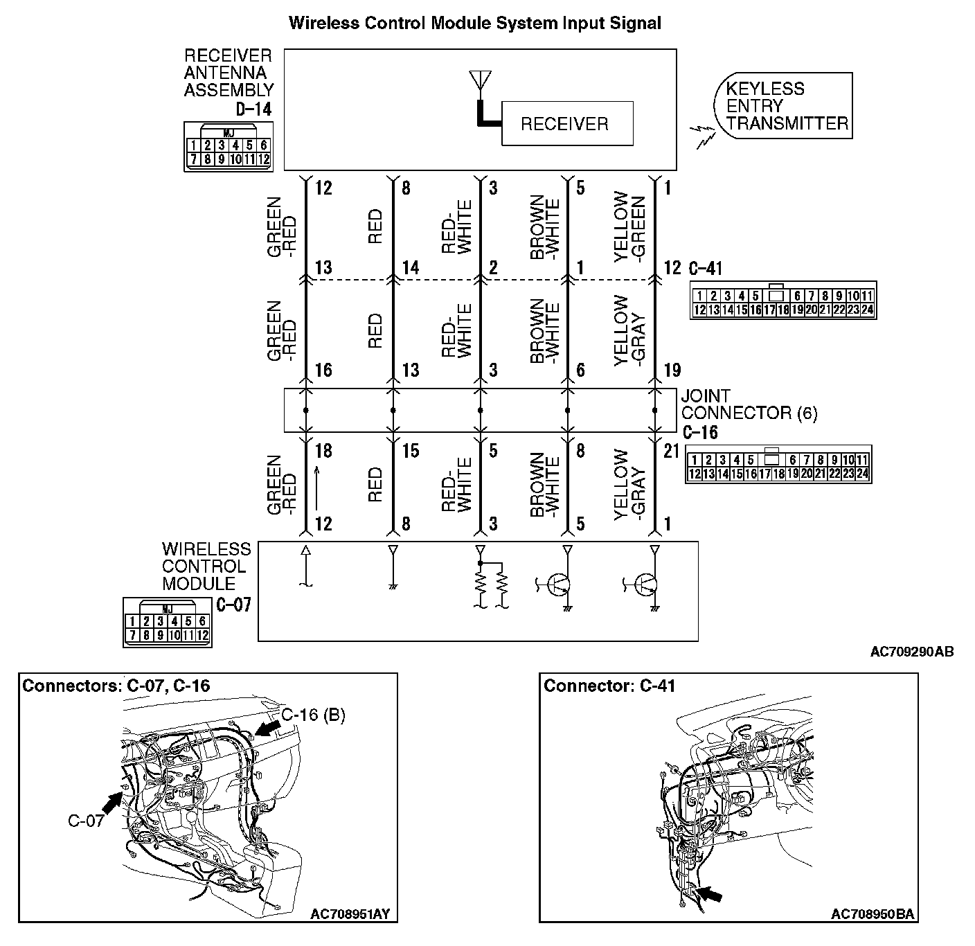 1. Disconnect receiver antenna assembly connector D-14 and WCM connector C-07, and check the wiring harness.