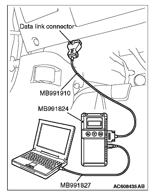 CAUTION: To prevent damage to scan tool MB991958, always turn the ignition switch to the "LOCK" (OFF) position before connecting or disconnecting scan toolMB991958.