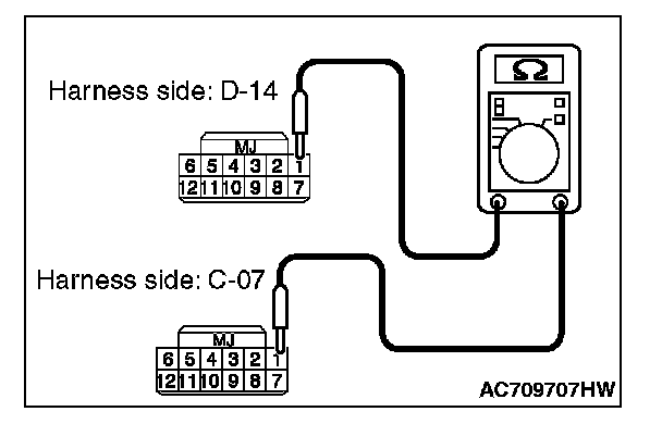 2. Check the wiring harness between receiver antenna assembly connector D-14(terminal No.1) and WCM connector C-07 (terminal No.1).