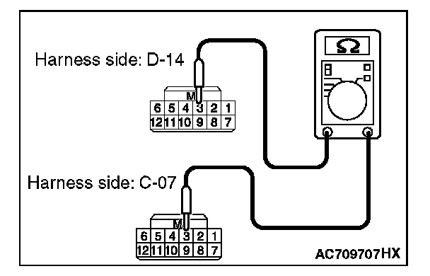 NO (receiver antenna assembly connector D-14 terminal No.3 - WCM connector C-07 terminal No.3.) : Repair the wiring harness between receiver antenna assembly connector D-14 (terminal No.3) and WCM connector C-07 (terminal No.3).