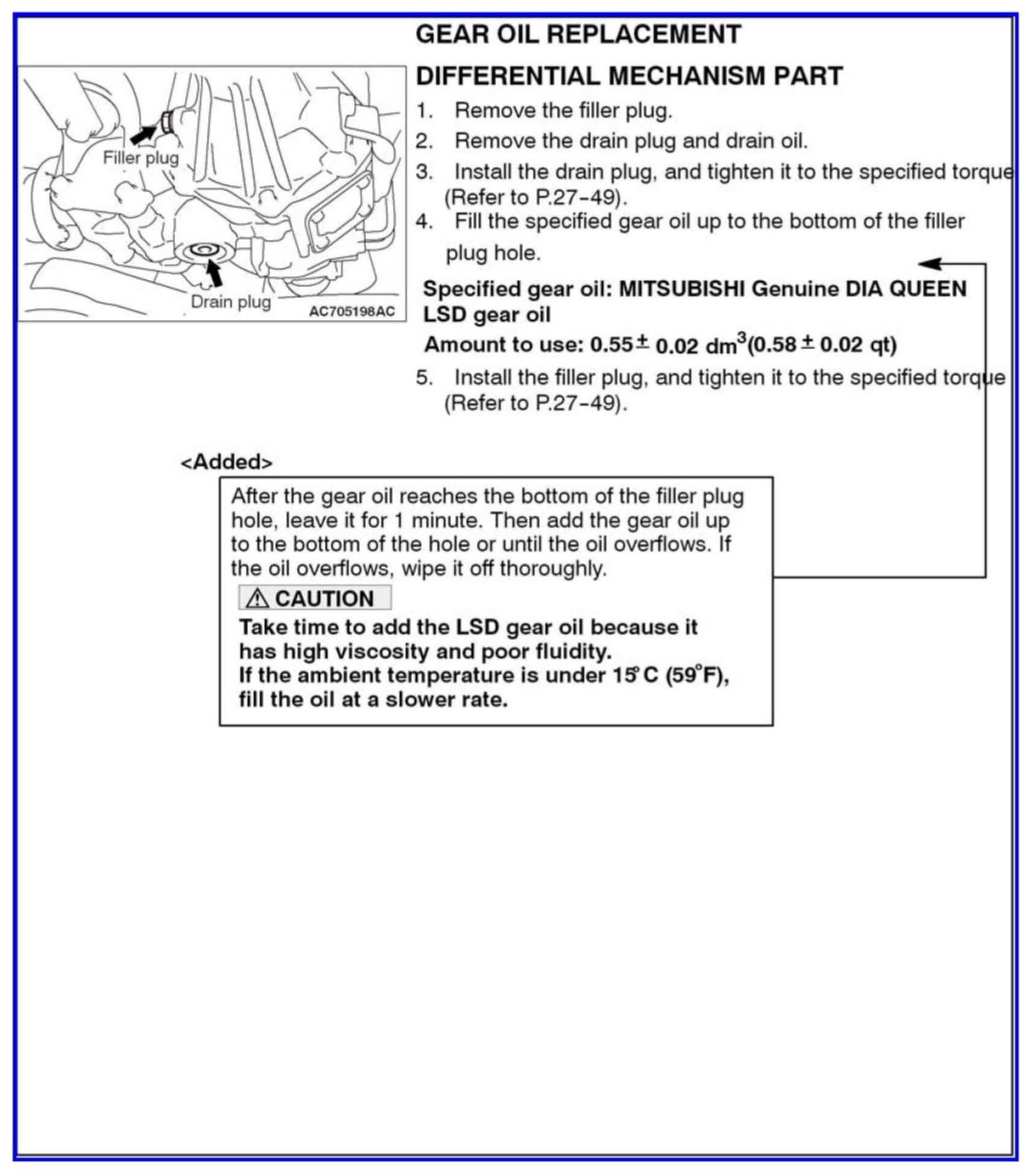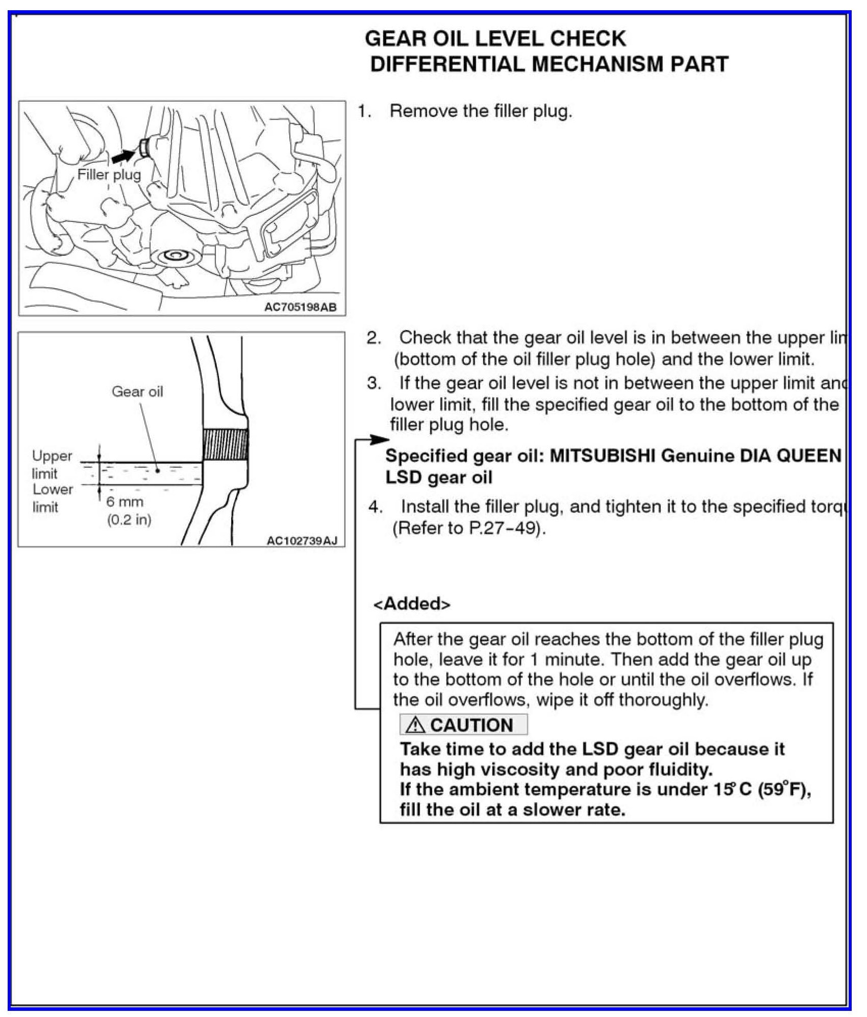 To ensure sufficient AYC differential gear oil filling, some precautionary instructions have been added to the gear oil level check and gear oil replacement procedures in the affected service manuals.