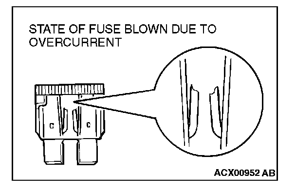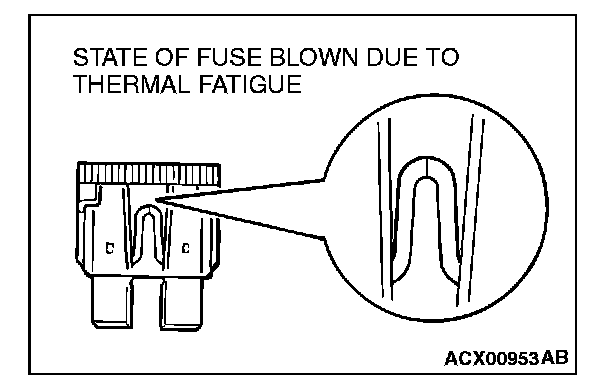 CAUTIONS IN EVENT OF BLOWN FUSEWhen a fuse is blown, there are two probable causes. One is that it is blown due to flow of current exceeding its rating. The other is that it is blown due to repeated on/off current flowing through it. Which of the two causes is responsible can be easily determined by visual check as described below.