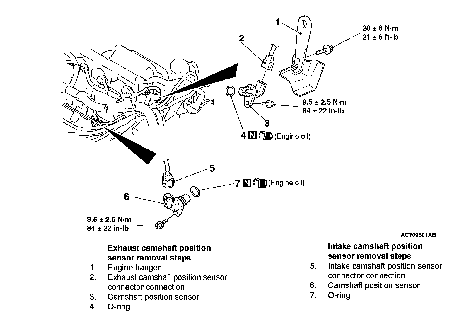Exhaust Camshaft Position Sensor Removal Steps 1-4, Intake Camshaft Position Sensor Removal Steps 5-7: