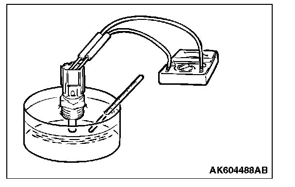 2. With the temperature sensing portion of engine coolant temperature sensor immersed in hot water, check the resistance.