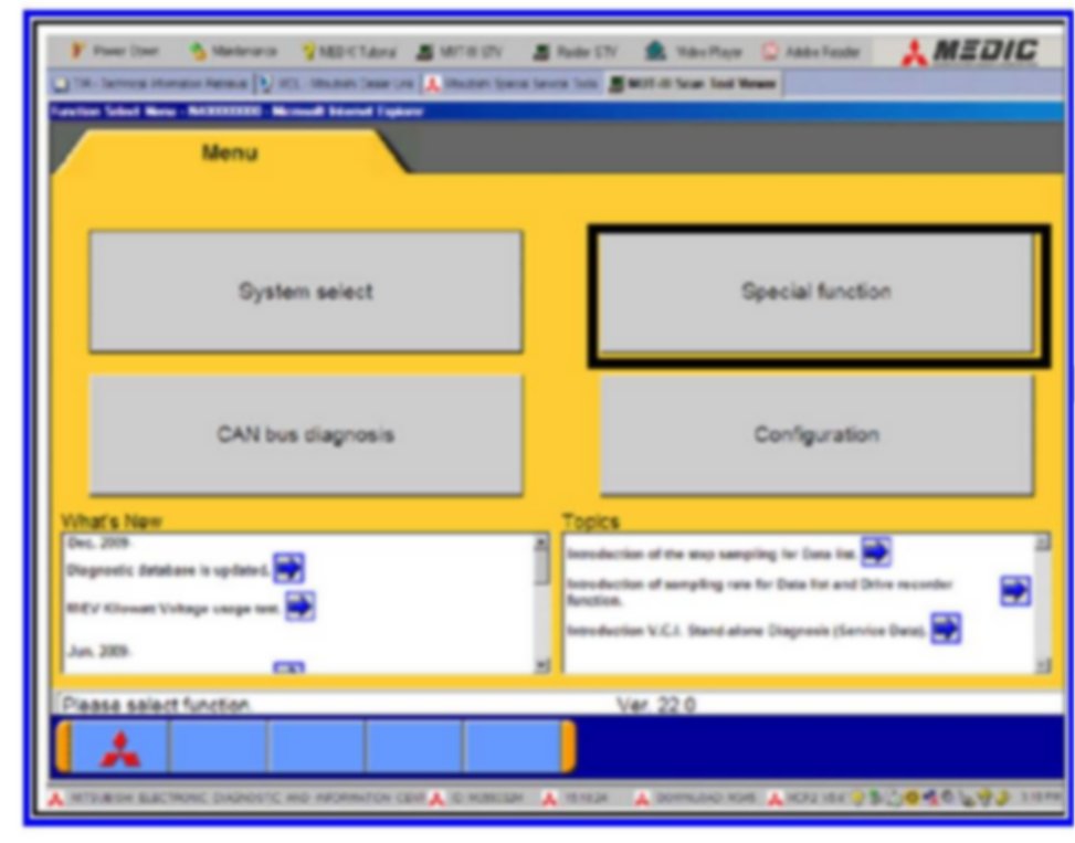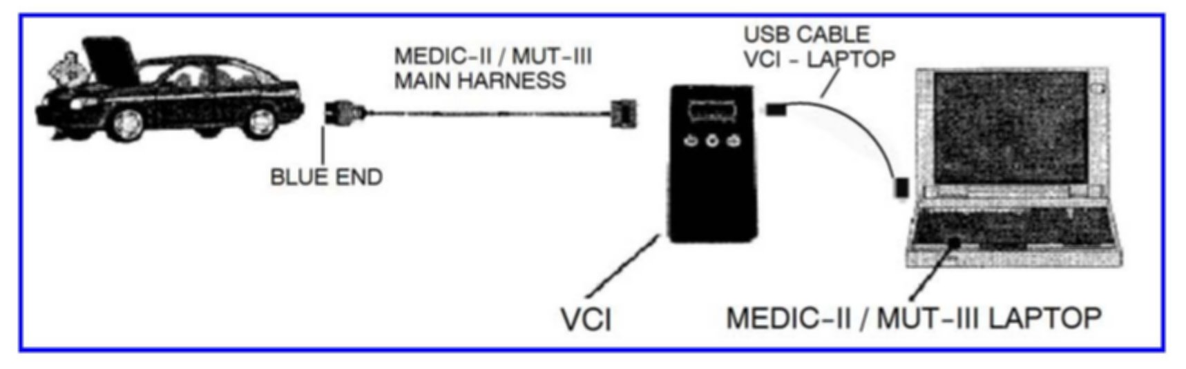 ^ Connect the MUT-III main harness with the blue DLC connection to the VCI.