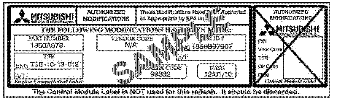 6. Using a ball-point pen, enter the appropriate Engine Control Module (ECM) part number, Software Part Number (ROM ID#), this Technical Service Bulletin number (TSB-10-13-005), your dealer code, and the current date on the Engine Compartment / Control Module Label (p/n MSSF024G00). The Vendor Code is not applicable. The label is available from your facing PDC.
