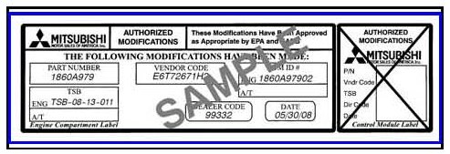 5. Using a ball-point pen, enter the appropriate Engine Control Module (ECM) part number, vendor number, Software Part Number, this technical service bulletin number (TSB-08-13-011), your dealer code, and the current date on the Engine Compartment / Control Module Label (p/n MSSF024G00). The label is available from your facing PDC.