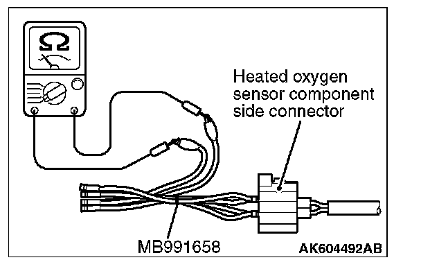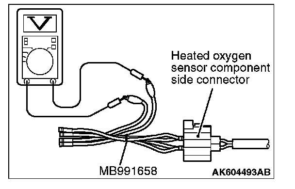 1. Disconnect the heated oxygen sensor connector and connect special tool MB991658 to the connector on the heated oxygen sensor side.