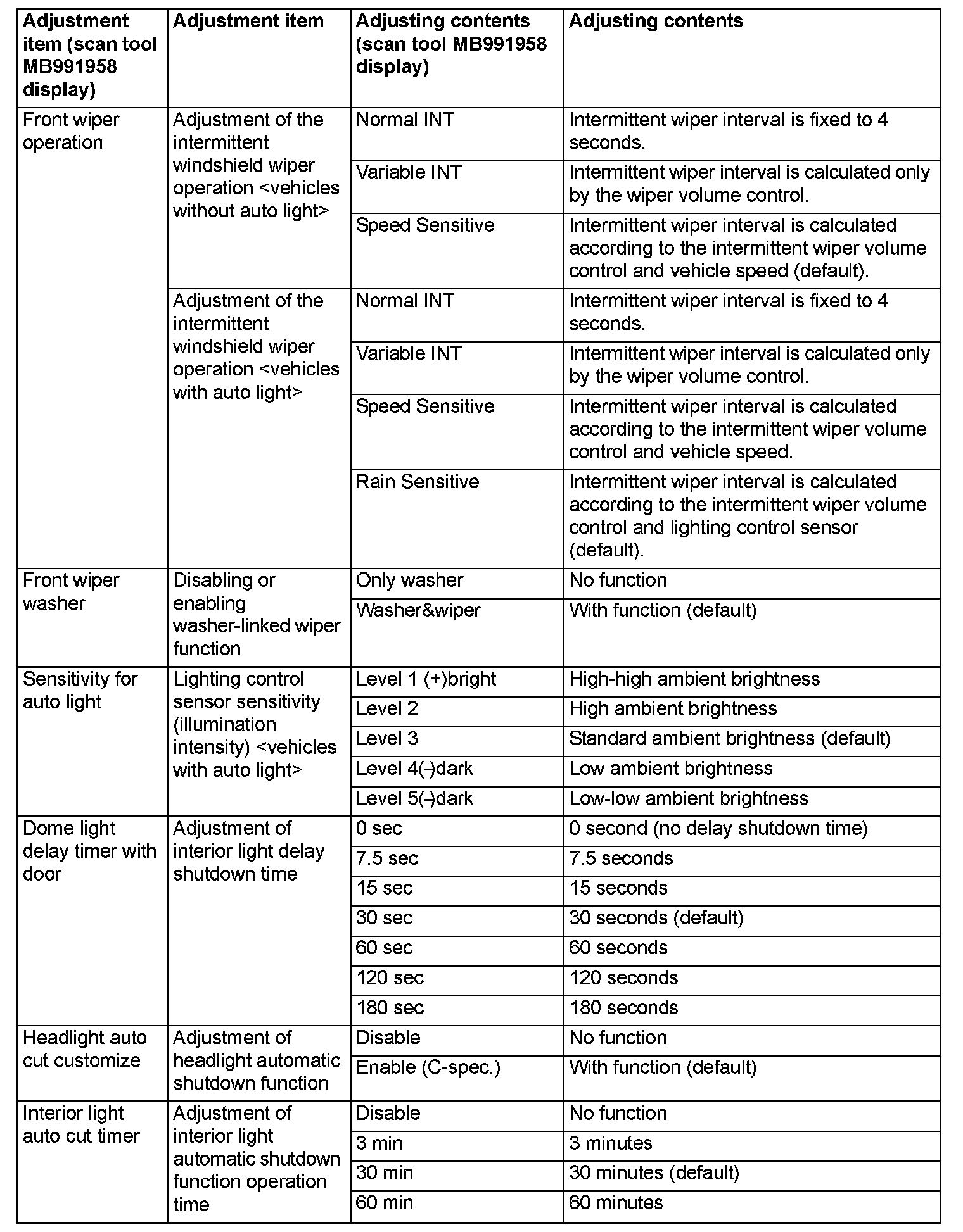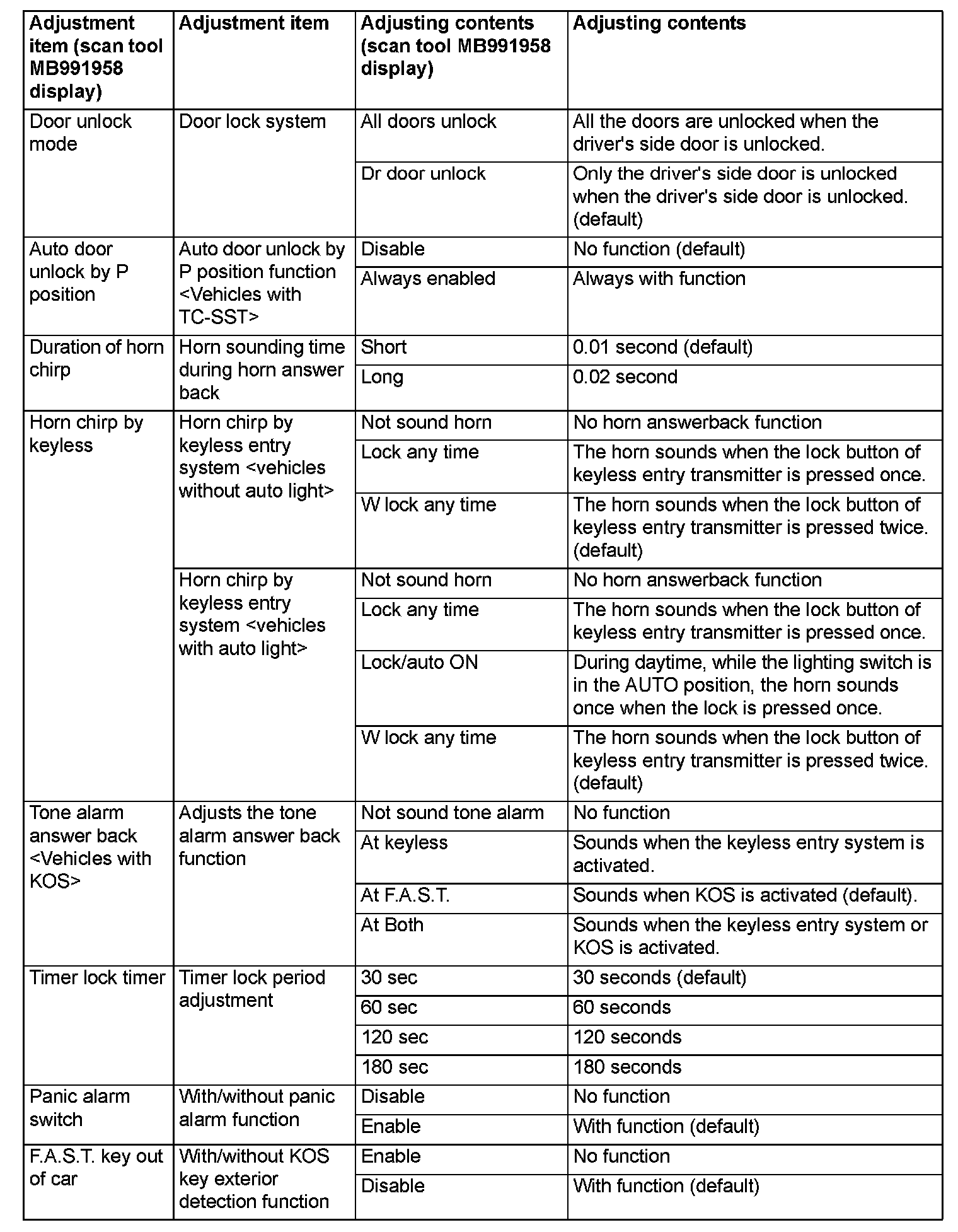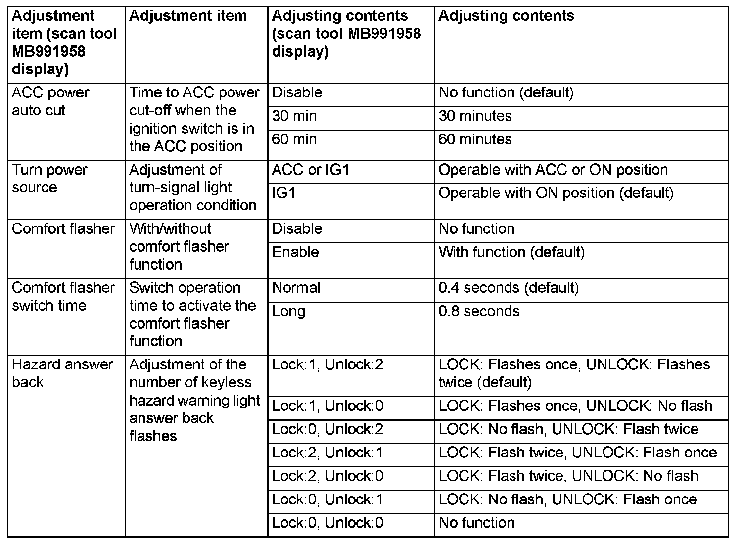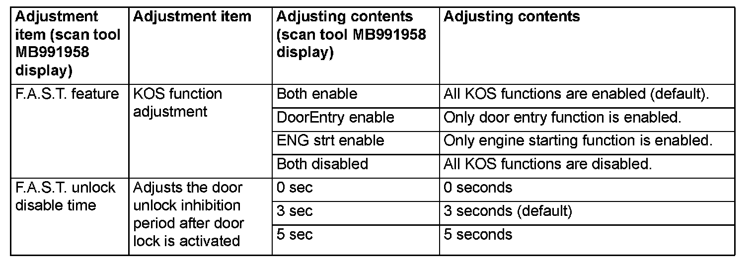 By operating the ETACS system or MMCS of scan tool MB991958, the following functions can be programmed. The programmed information is held even when the battery is disconnected.