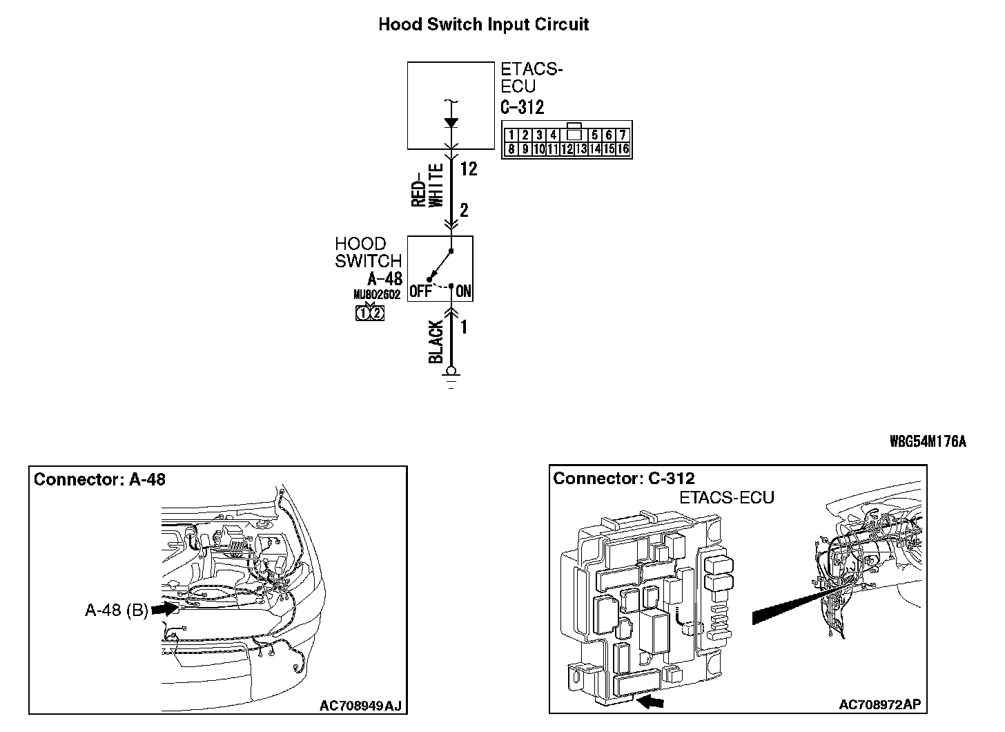 STEP 3. Check the ground circuit to the hood switch. Test at hood switch connector A-48.