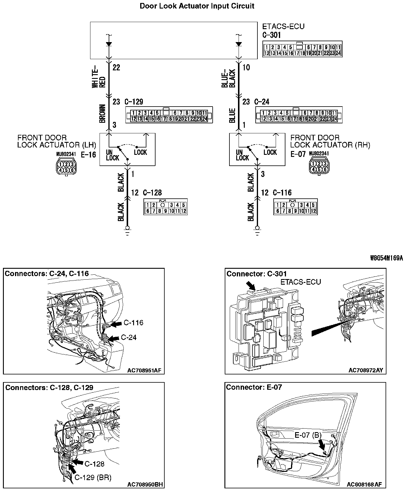 STEP 7. Check the wiring harness between front door lock actuator (LH) connector E-16 (terminal 3) and ETACS-ECU connector C-301 (terminal 22). Check the input lines for open circuit and short circuit.