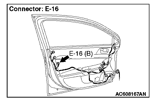 Disconnect front door lock actuator (LH) connector E-16. Then check continuity between the terminals.