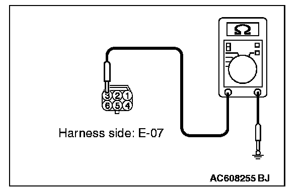 Disconnect front door lock actuator (RH) connector E-07. Then check continuity between the terminals.