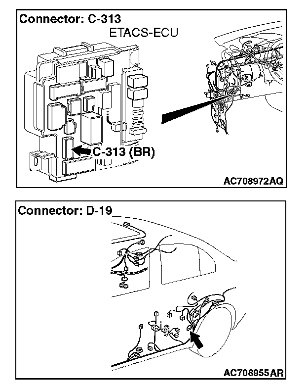 STEP 5. Check the wiring harness between driver's door switch connector D-19 (terminal 3) and ETACS-ECU connector C-313 (terminal 7).