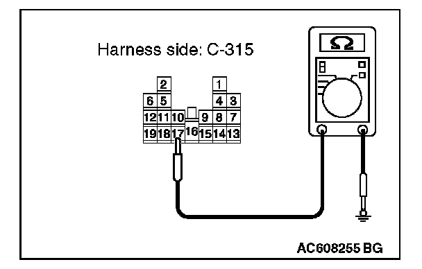 2. Measure the resistance value between ETACS-ECU connector C-315 terminal 17 and ground.