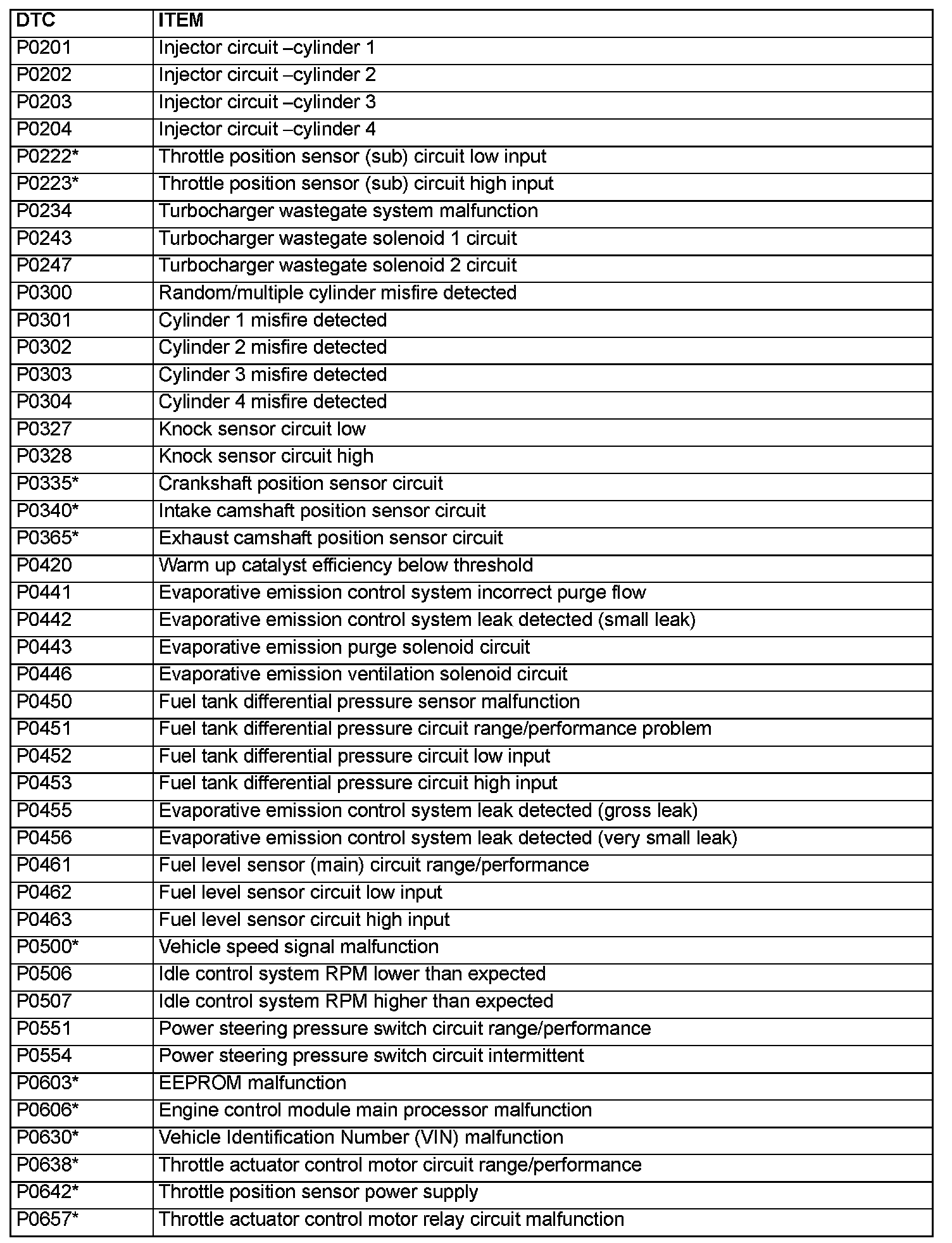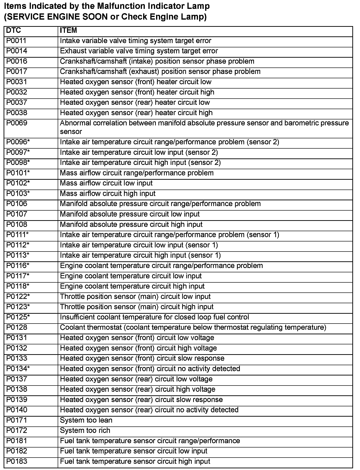 - After the ECM has detected a malfunction, the Malfunction Indicator Lamp (SERVICE ENGINE SOON or Check Engine Lamp) illuminates when the engine is next turned on and the same malfunction is re-detected. However, for items marked with a "*" in the DTC NO. column, the Malfunction Indicator Lamp (SERVICE ENGINE SOON or Check Engine Lamp) illuminates only on the first detection of the malfunction.