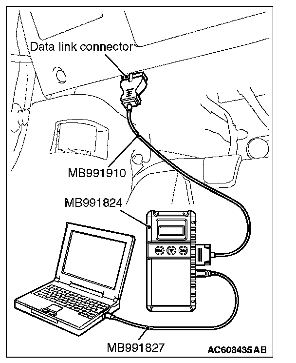 CAUTION: To prevent damage to scan tool MB991958, always turn the ignition switch to the "LOCK" (OFF) position before connecting or disconnecting scan tool MB991958.