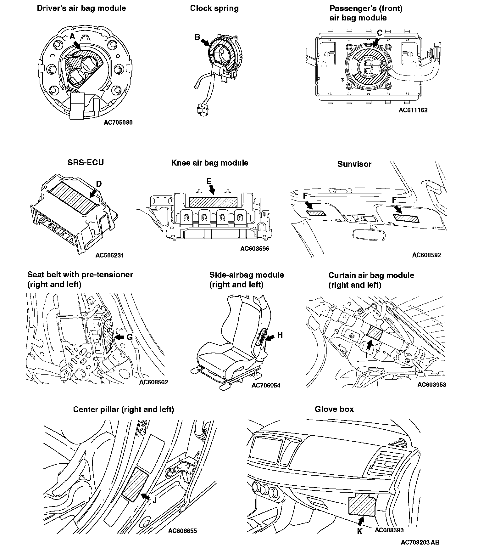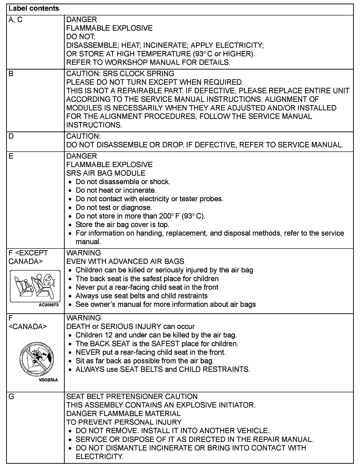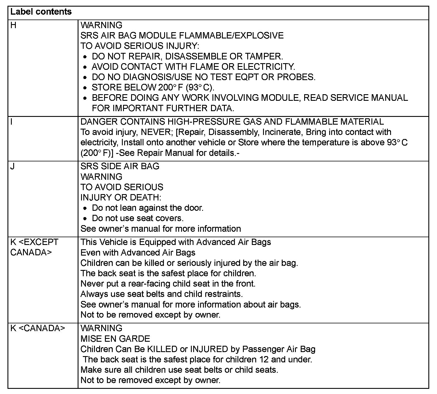 WARNING/CAUTION LABELSA number of caution labels related to the SRS are found in the vehicle, as shown in the following illustrations. Follow label instructions when servicing SRS. The label I is not to be removed except by owner. If the other labels are dirty or damaged, replace them.