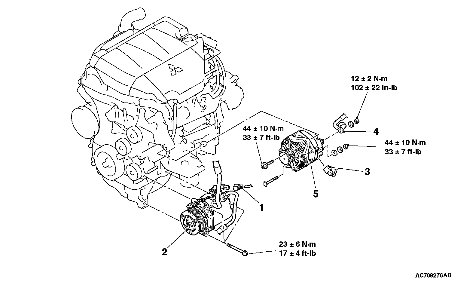 Tighten A/C compressor and clutch assembly mounting bolts to the specified torque in the order of number shown in the illustration.