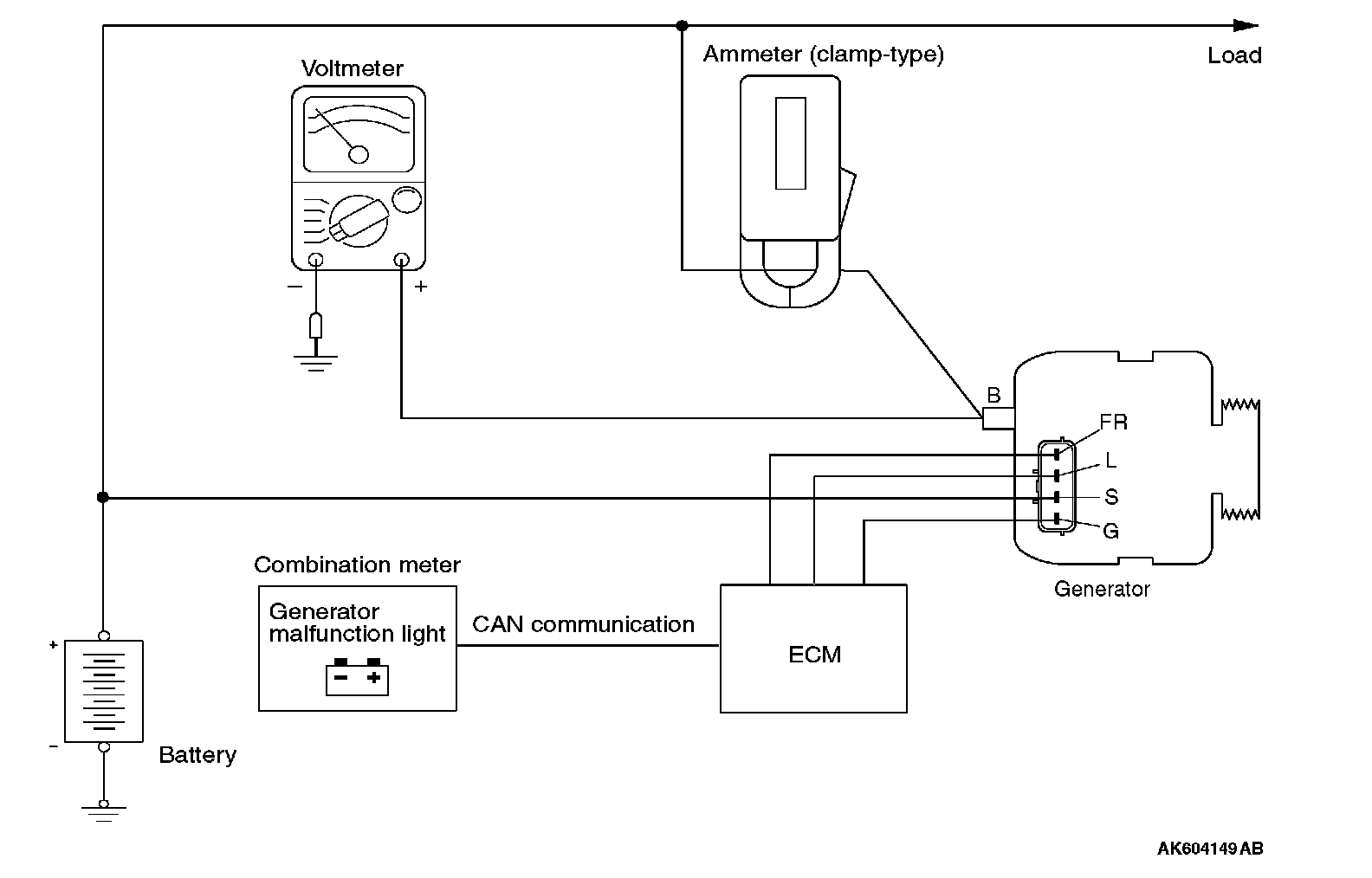 If the electrical load is small while testing, the specified level of current may not be output even though the generator is normal. In such cases, increase the electrical load by leaving the headlights turned on for some time to discharge the battery or by using the lighting system in another vehicle, and then test again.