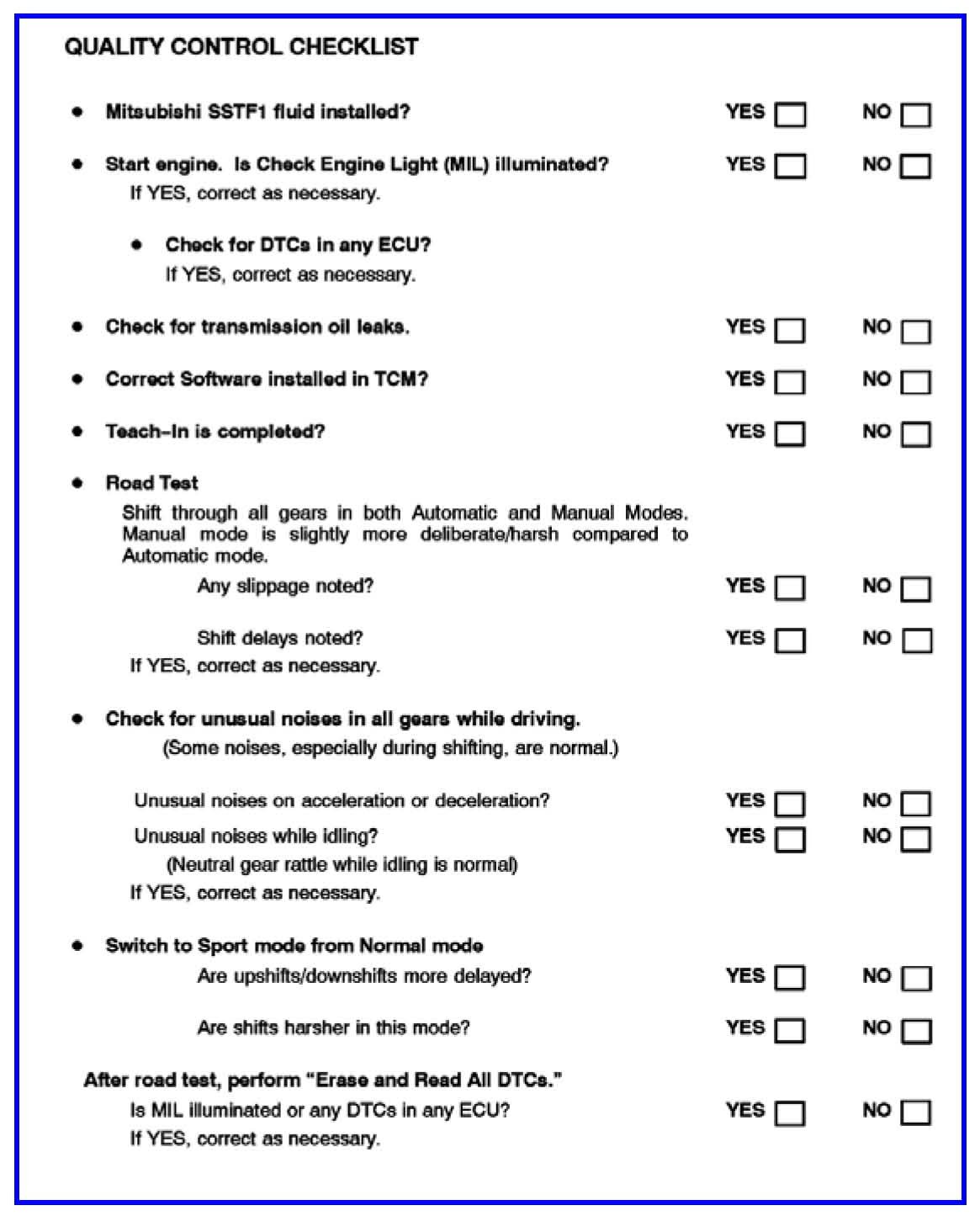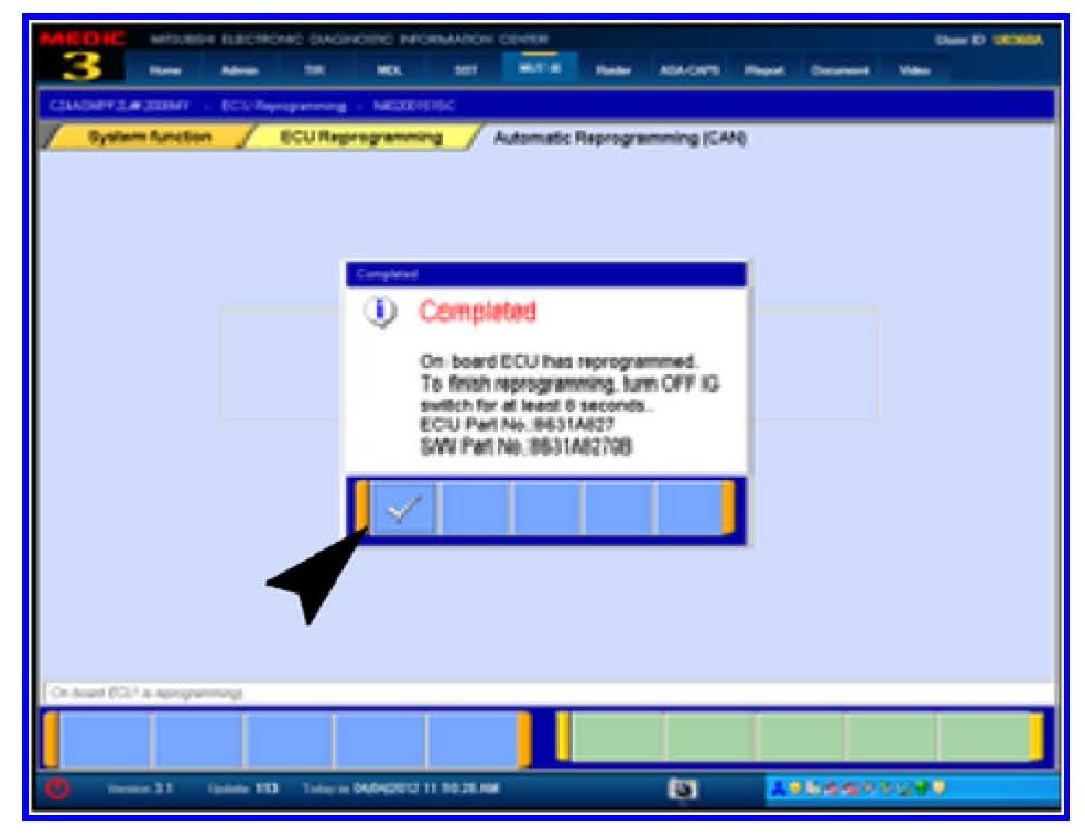 21. Repair and programming procedures for a vehicles using software version 001 are complete. Turn the ignition to the LOCK position disconnect the MUT-III and the battery charger and proceed to the Quality Control Checklist to verify repairs.