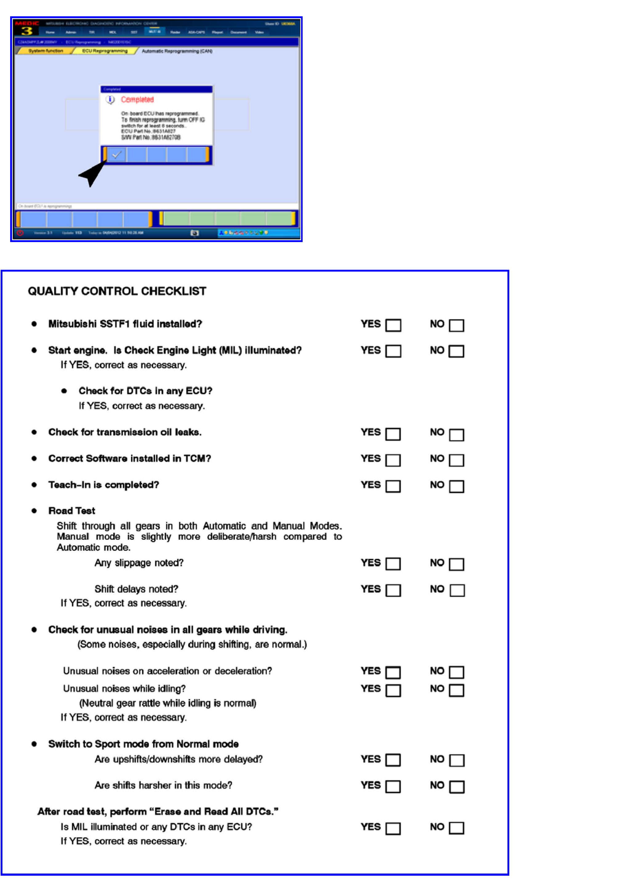 21. Repair and programming procedures for a 2008 Lancer Evolution are complete. Turn the ignition to the LOCK position, disconnect the MUT-III and the battery charger and proceed to the Quality Control Checklist to verify repairs.