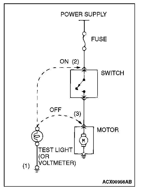 3. Then, connect the test light or voltmeter to the motor connector. The test light should not come on, or the voltmeter should indicate no voltage. When the switch is turned ON in this state, the test light should come on, or the voltmeter should indicate a voltage, with the motor starting to run.