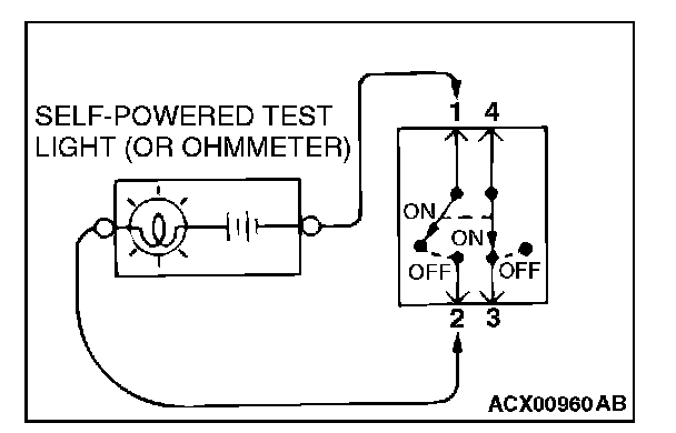 2. When the switch is the "ON" position and the contact points of terminals 3 and 4 are connected, the self-powered test light should come on or the ohmmeter should read 0 ohm.