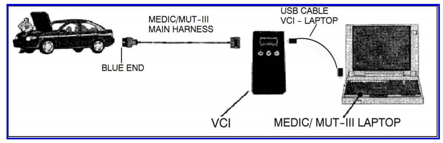 ^ Connect the MUT-III main harness with the blue DLC connection to the VCI.