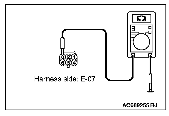 Disconnect front door lock actuator (RH) connector E-07. Then check continuity between the terminals.