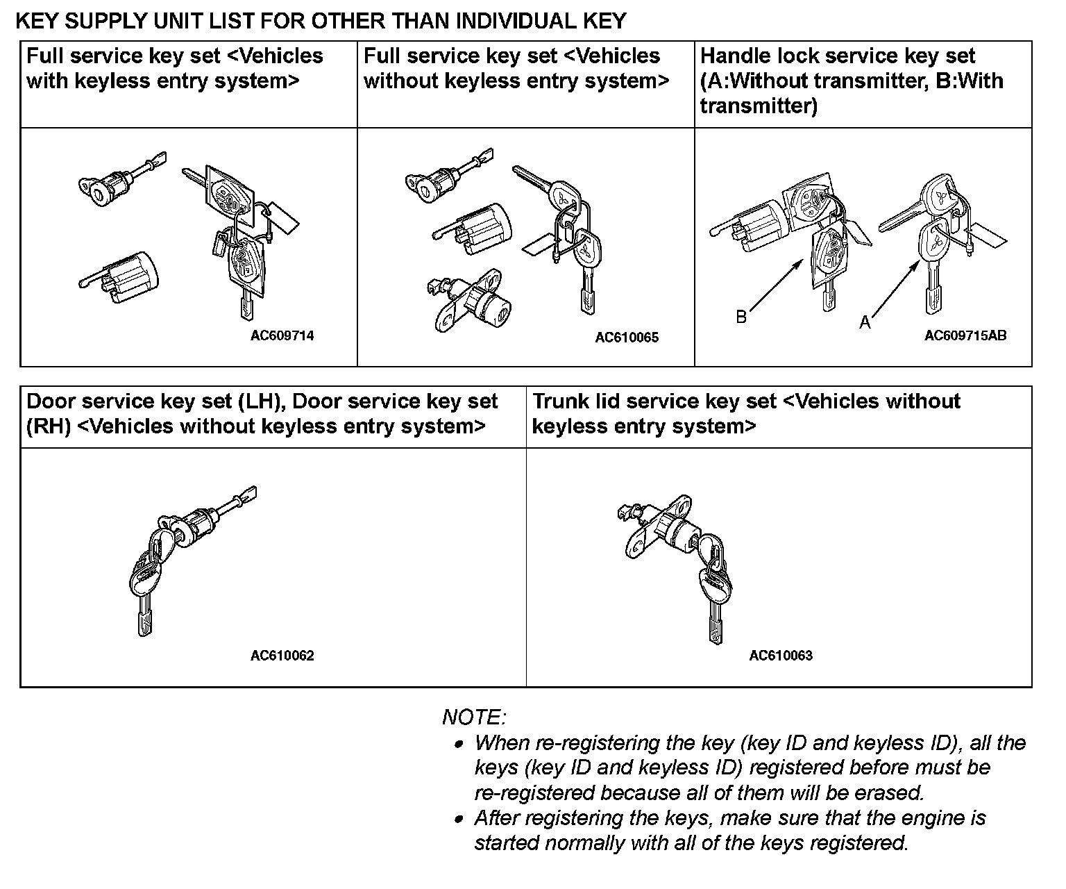 When the keyless ID code is already registered in the transmitter, the keyless ID code can be registered without using the scan tool MB991958 (M.U.T.-III sub assembly) according to the following procedures.