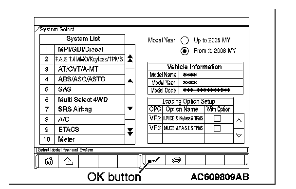 2. Select "F.A.S.T./IMMO/Keyless/TPMS" button from the "System Select" screen. Then, select the applicable option code item and push the OK button.