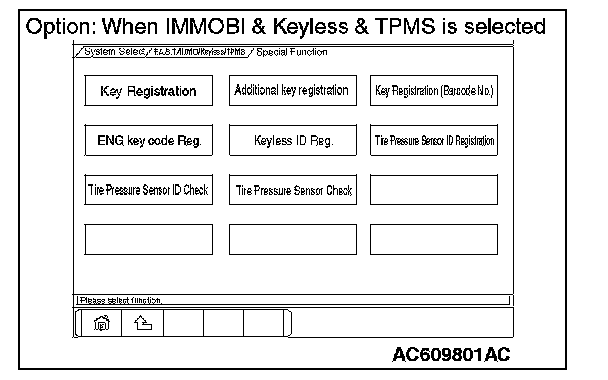 The ID codes necessary for the engine immobilizer system, the keyless entry system and the TPMS can be registered using the scan tool MB991958 (M.U.T.-III sub assembly). KOS and keyless operation key are indicated as F.A.S.T and F.A.S.T.-key respectively in the scan tool