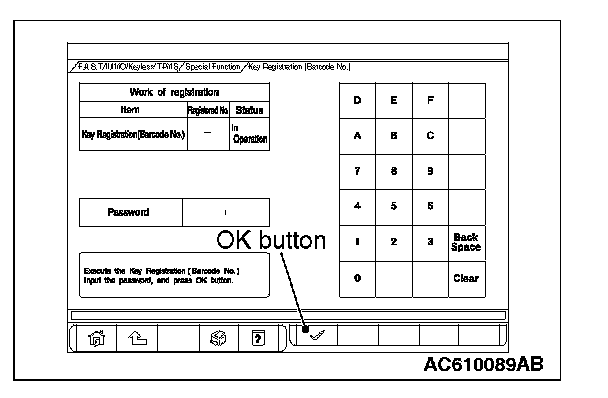 1. When "Key Registration (Barcode No.)" screen is displayed, enter the password for the key registration and press the OK button.