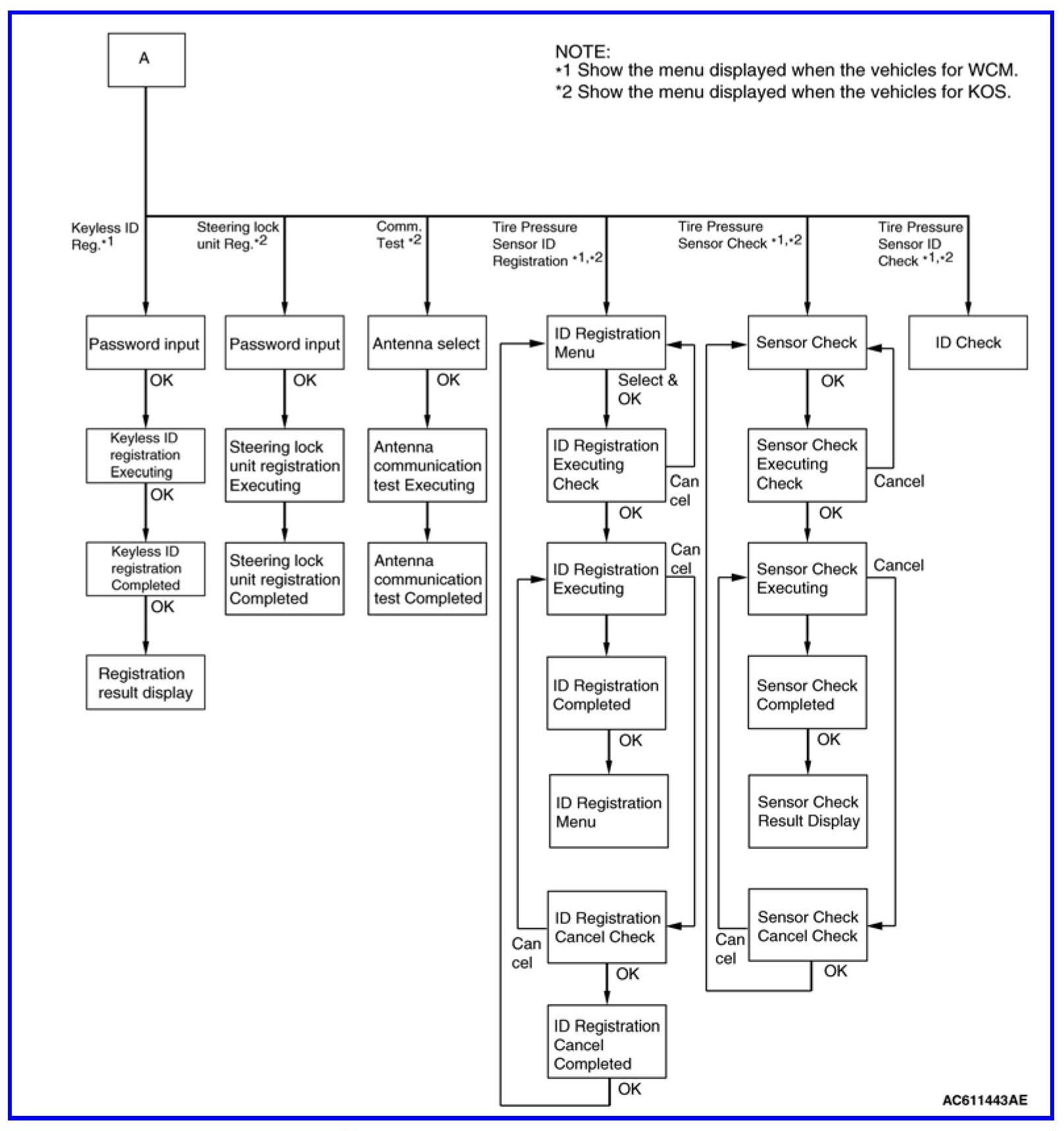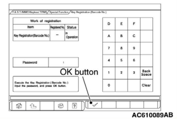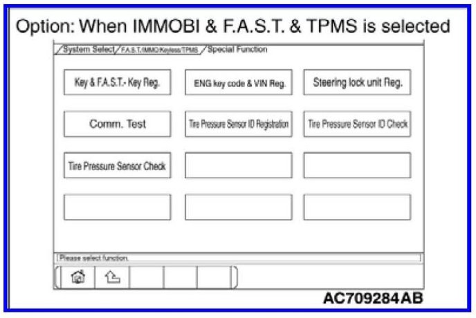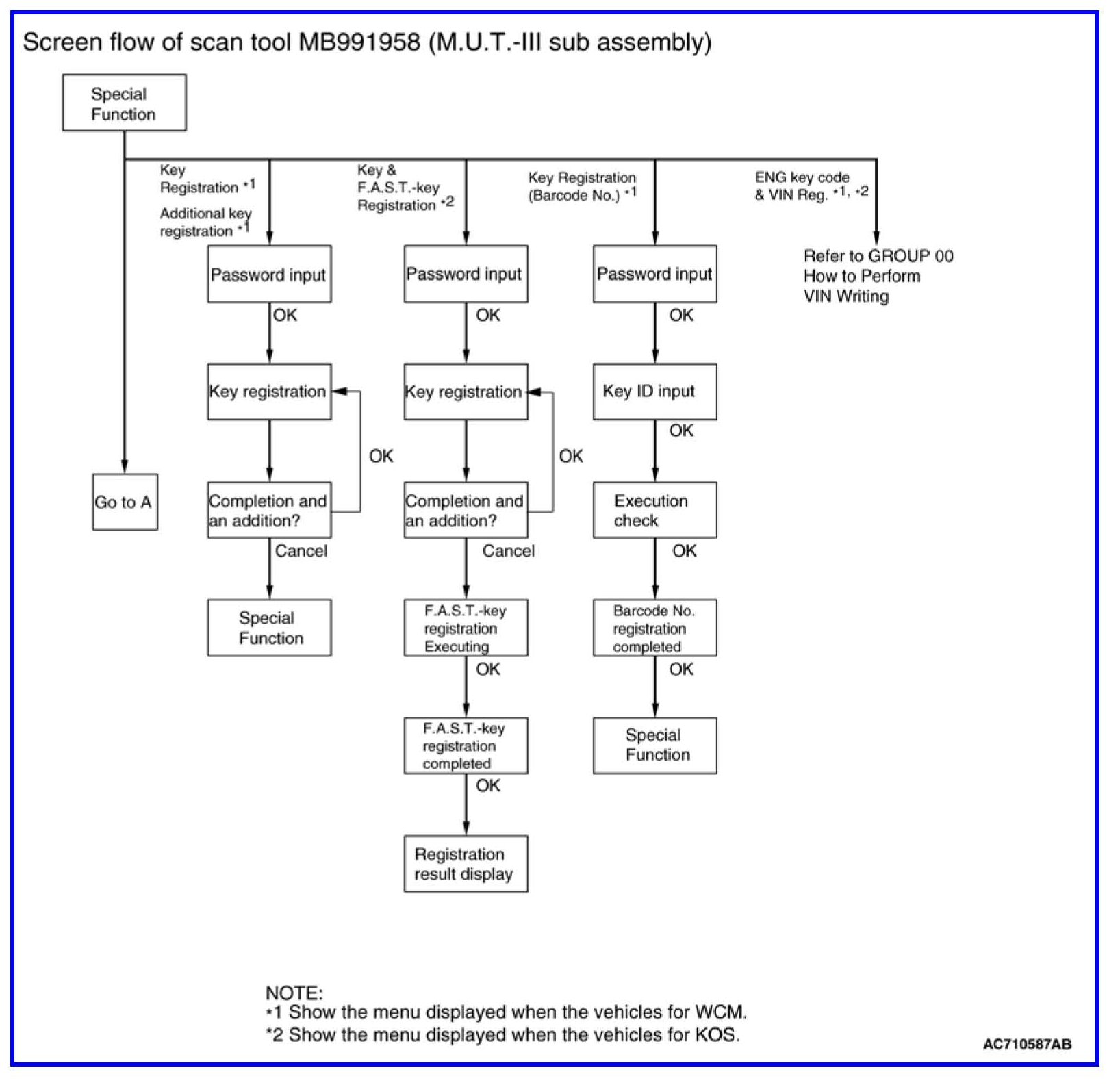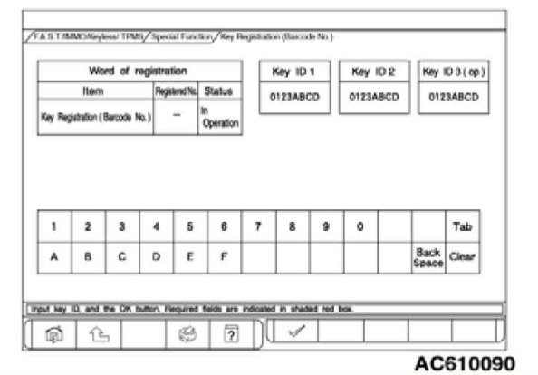 The ID codes necessary for the engine immobilizer system, the keyless entry system and the TPMS can be registered using the scan tool MB991958 (M.U.T.-III sub assembly). KOS and keyless operation key are indicated as F.A.S.T and F.A.S.T.-key respectively in the scan tool MB991958 (M.U.T.-III sub assembly) screen.