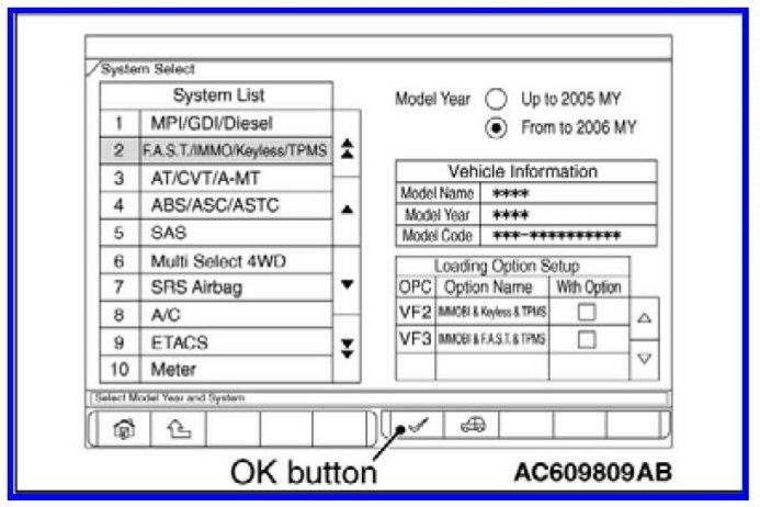 2. Select "F.A.S.T./IMMO/Keyless/TPMS" button from the "System Select" screen. Then, select the applicable option code item and push the OK button.