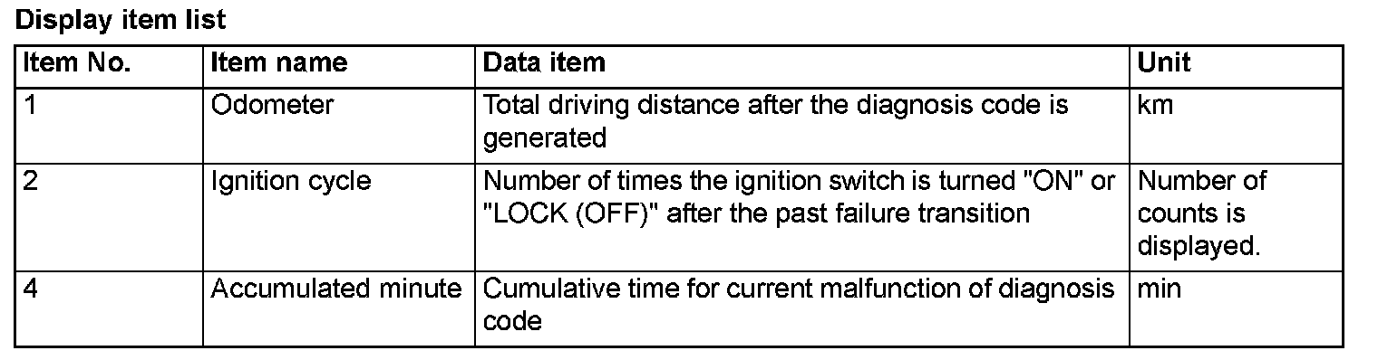 When detecting fault and storing the diagnosis code, the ECU connected to CAN bus line obtains the data before the determination of the diagnosis code and the data when the diagnosis code is determined, and then stores the ECU status of that time. By analyzing each data from M.U.T.-III, the troubleshooting can be performed more efficiently. The displayed items are as the table below.