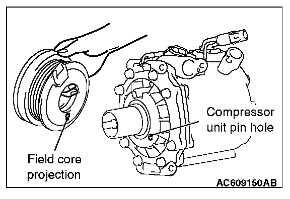 Line up the pin hole on the compressor unit with the field core projection and attach.