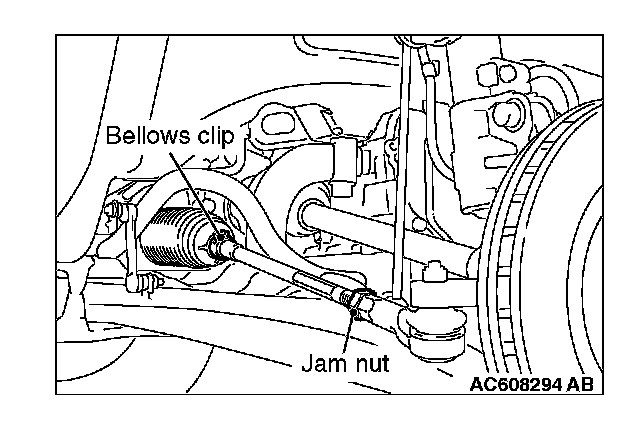 1. Adjust the toe-in by undoing the clip and jam nut, and turning the left and right tie rod turnbuckles by the same amount (in opposite directions).