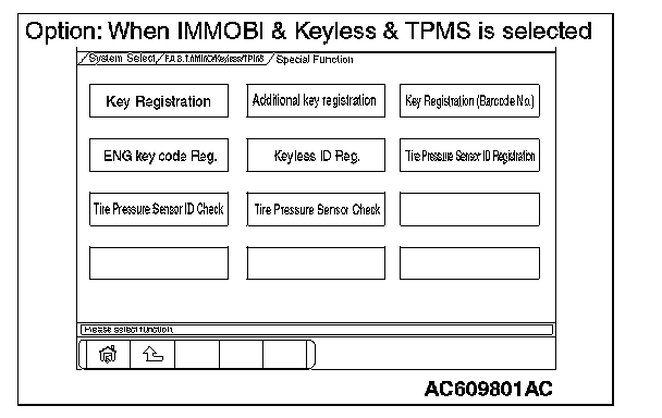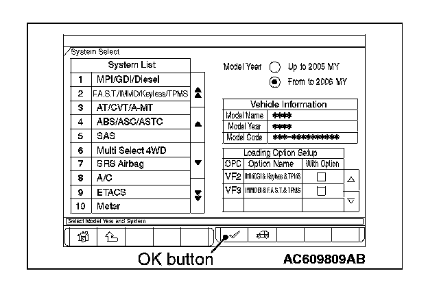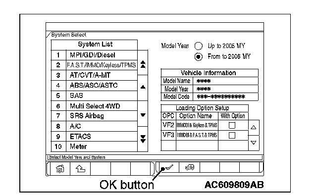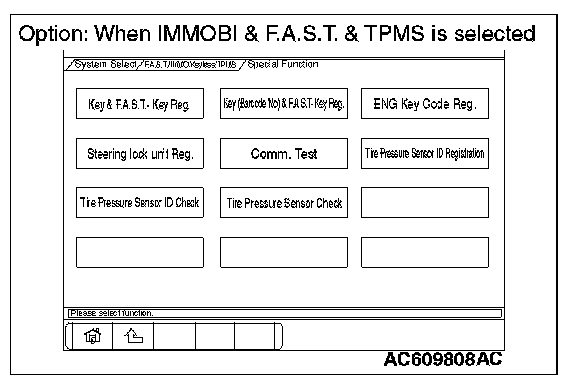 8. Select "F.A.S.T/IMMO/Keyless/TPMS" button from the "System Select" screen. Then, select the applicable option code item and push the OK button.